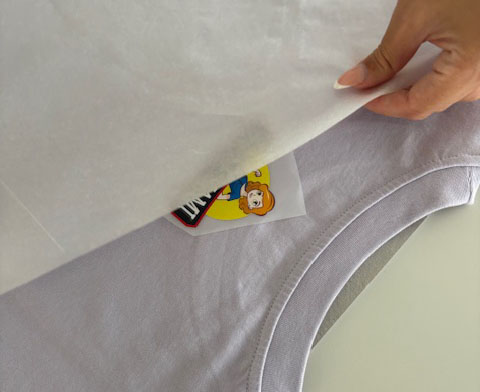 - Nun legen Sie vorsichtig das Backpapier über die positioniert Folie - achten Sie darauf, dass Sie dir vorher platzierte Folie nicht verschieben. Das Backpapier schützt die Folie und Grafik vor direktem Kontakt mit dem Bügeleisen.