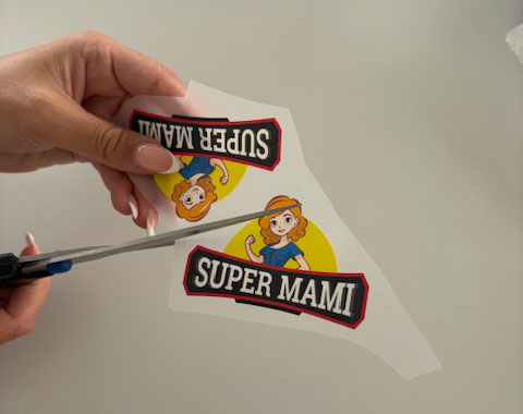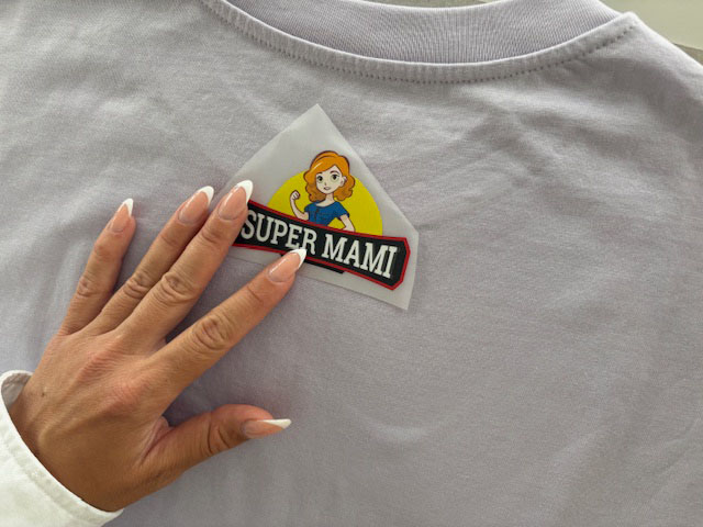 - Legen Sie die Grafik, welche Sie zuvor aus dem Bogen ausgeschnitten haben (keine Angst - die Beschnittränder oder nicht bedruckte Folienteile sind nach der Übertragung nicht sichtbar) auf das Textil. Achten Sie darauf, dass Sie die DTF-Folie so drauf legen, wie diese sein soll. Also Bildseite nach oben - Klebeschicht nach unten. Richten Sie diese genau so aus wie Sie es sich wünschen.