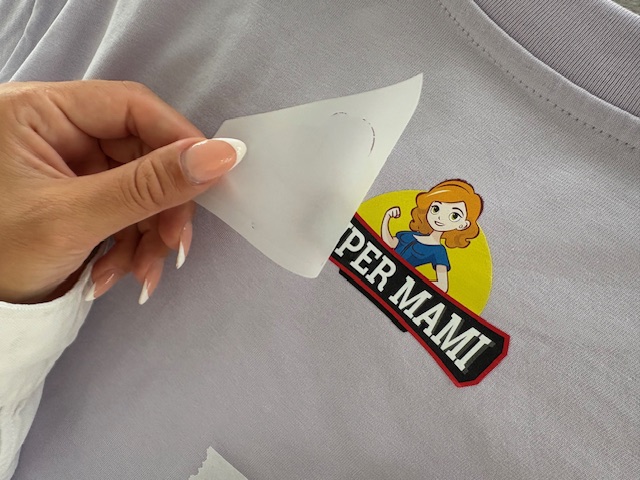 - Lassen Sie die Folie nach dem Pressvorgang einige Sekunden abkühlen. Entfernen Sie das Backpapier (dieses können Sie für weitere Applikationen wieder verwenden). Nehmen Sie die DTF-Folie an einer Ecke und entfernen diese langsam und vorsichtig. Falls Sie die Grafik an der Folie kleben bleibt wiederholen Sie den Pressvorgang (Backpapier nicht vergessen).