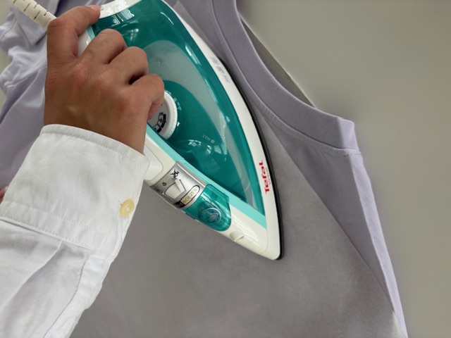 - Mit leichtem Druck halten Sie das Bügeleisen ca. 5 Sekunden auf den Übertragungsort. Dadurch wird das Textil entfeuchtet und glatt und ist somit ideal vorbereitet für eine erfolgreiche Applikation der DTF-Transferfolie.