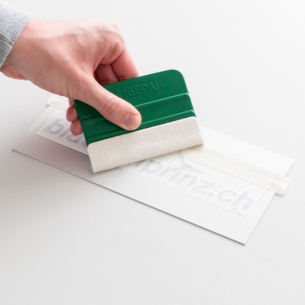 3. Rakeln Sie die Klebeschriften mit leichten Druck von oben nach unten fest. Bei einem zweiten Druchgang mit etwas mehr Druck.